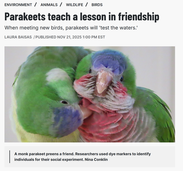 My first dissertation chapter, Monk parakeets ‘test the waters’ when forming new relationships, was featured in Popular Science. Check out the article here!!